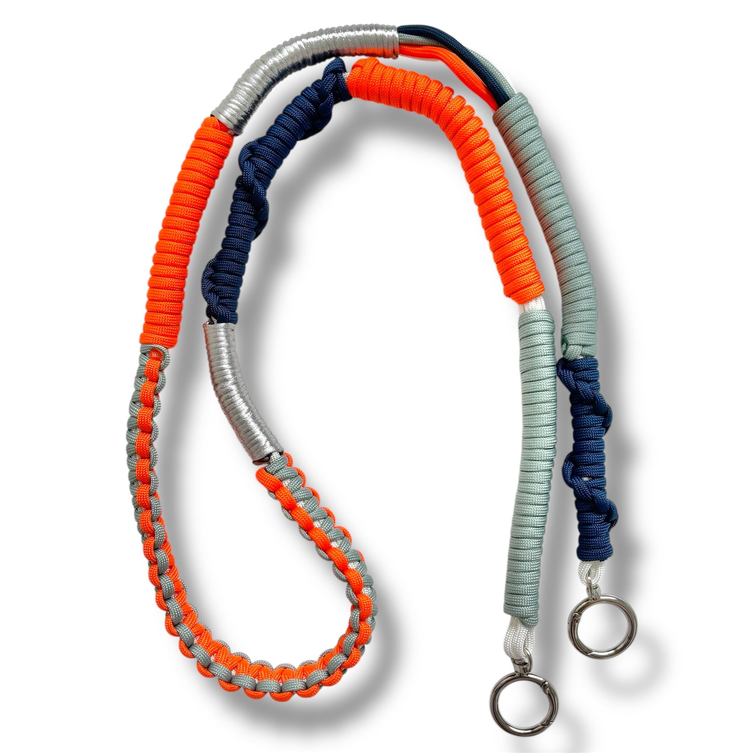 オレンジ、ネイビー、スモークブルーで編み上げたショルダーストラップです。