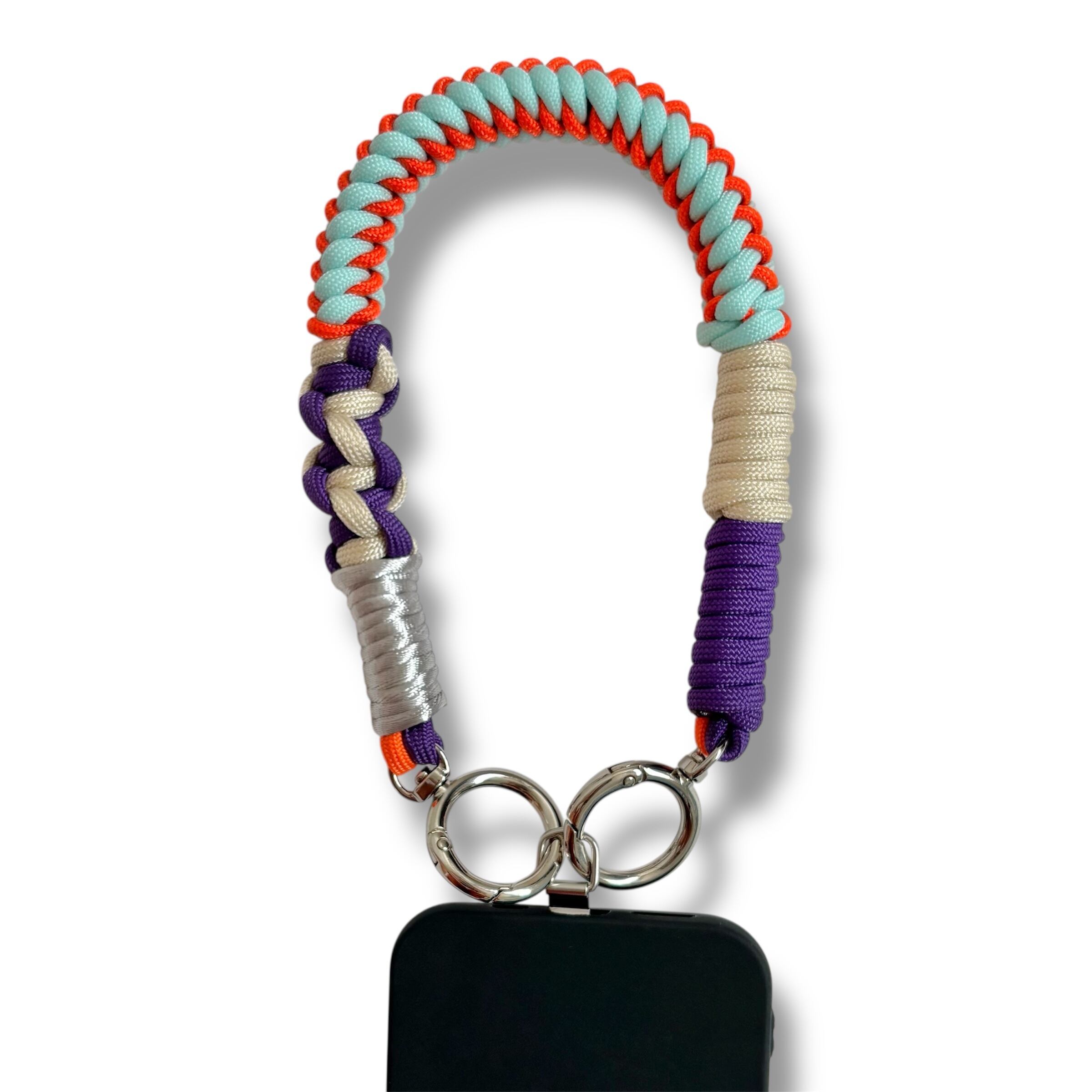 パープル、オレンジ、ベビーブルーで編み上げたショートストラップです