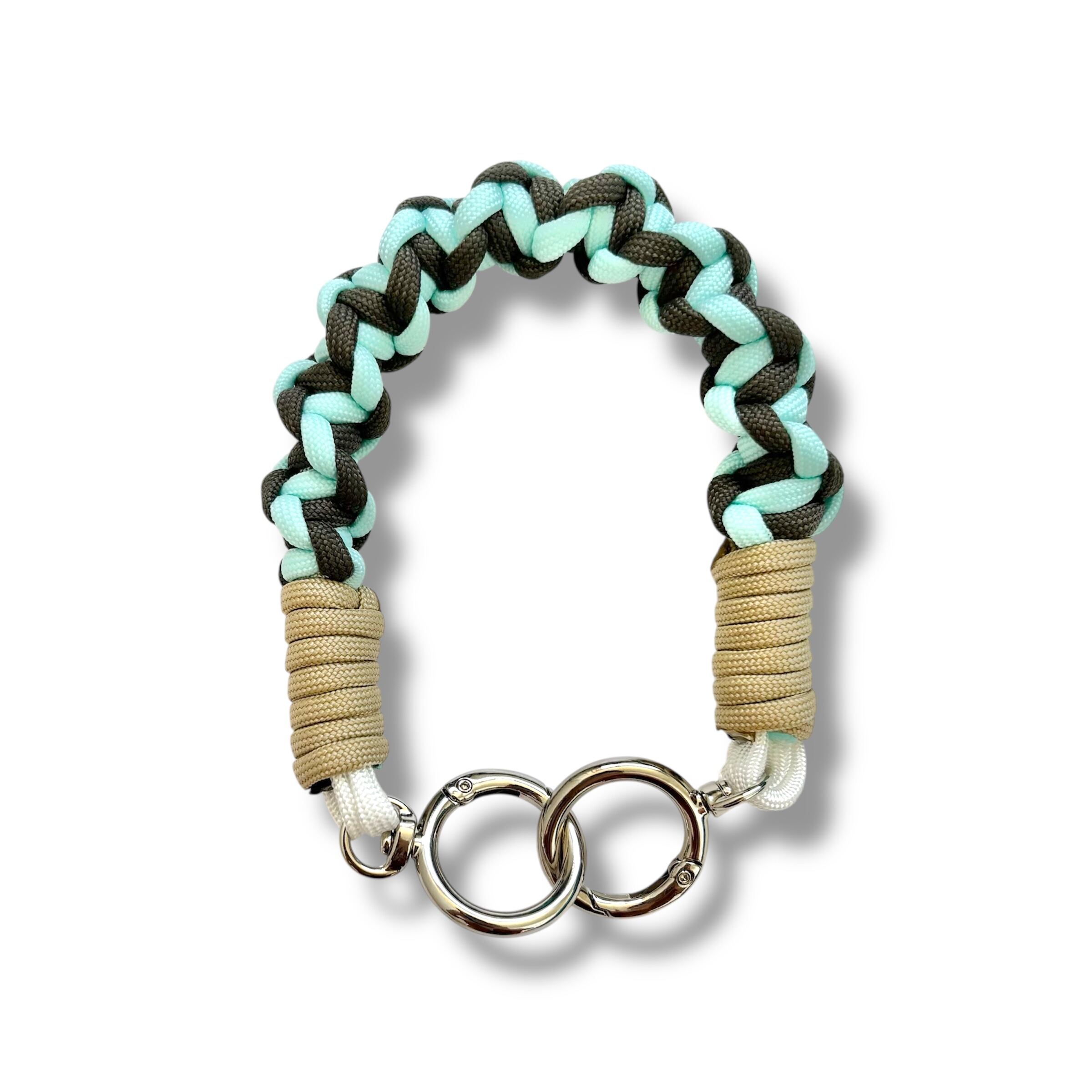 ベビーブルーとスモークブラウンで編み上げたショートストラップです