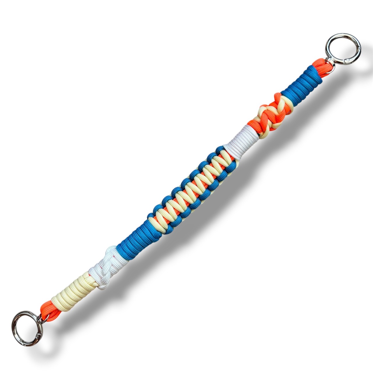 クリームイエロー、スカイブルー、オレンジで編み上げたハンドストラップです。