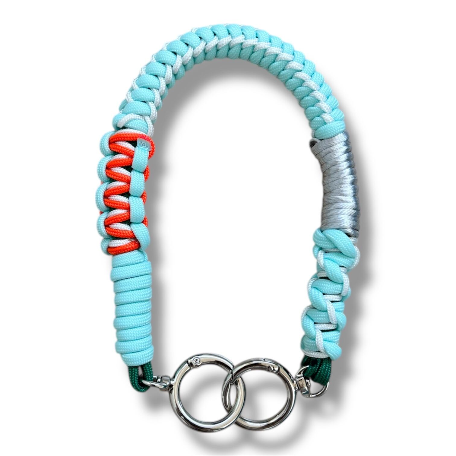 ベビーブルー、オレンジ、ホワイトで編み上げたショートストラップです。